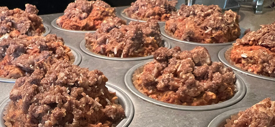 - Scoop batter into muffin cups (almost level with top, leaving some roof for streusel).