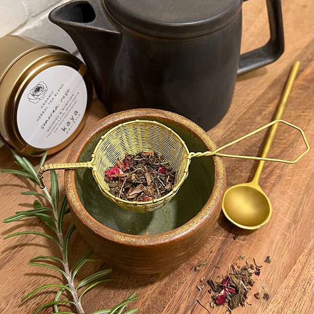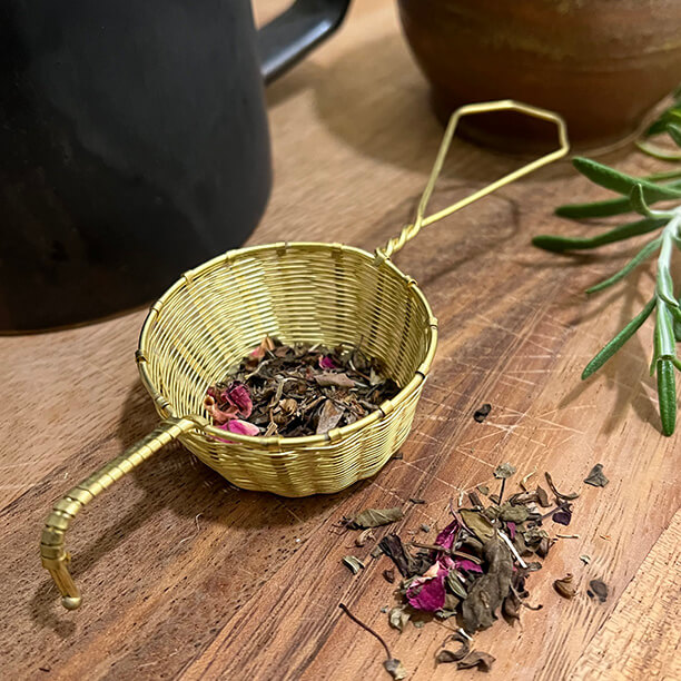 This solid brass tea strainer by Anima Mundi is handwoven in India by the same artisans who craft their brass spoons. Designed for a single cup, it fits perfectly in a mug, making it easy to brew your favorite loose leaf tea, herbs, or flowers. The handle lets you lift and remove it effortlessly.