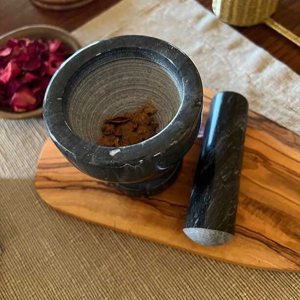 Bring ritual and flavor to your kitchen with our Black Marble Mortar & Pestle. Its unpolished interior is perfectly textured to grind herbs and spices to their fullest potential, unlocking aromas and flavors you’ll never get from pre-ground pantry staples.